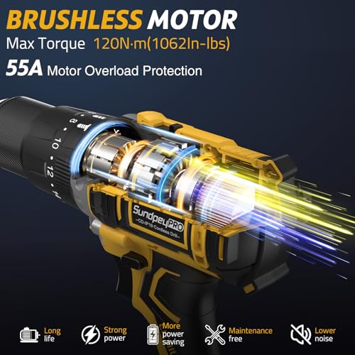 SundpeyPRO 21 V borstelloze accu-slagboorschroevendraaier, 120 Nm Max klopboormachine, accuschroevendraaier met 2 x 4,0 Ah accu’s, 13 mm boorhouder, 2 versnellingen